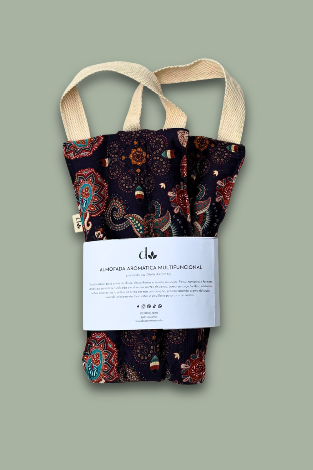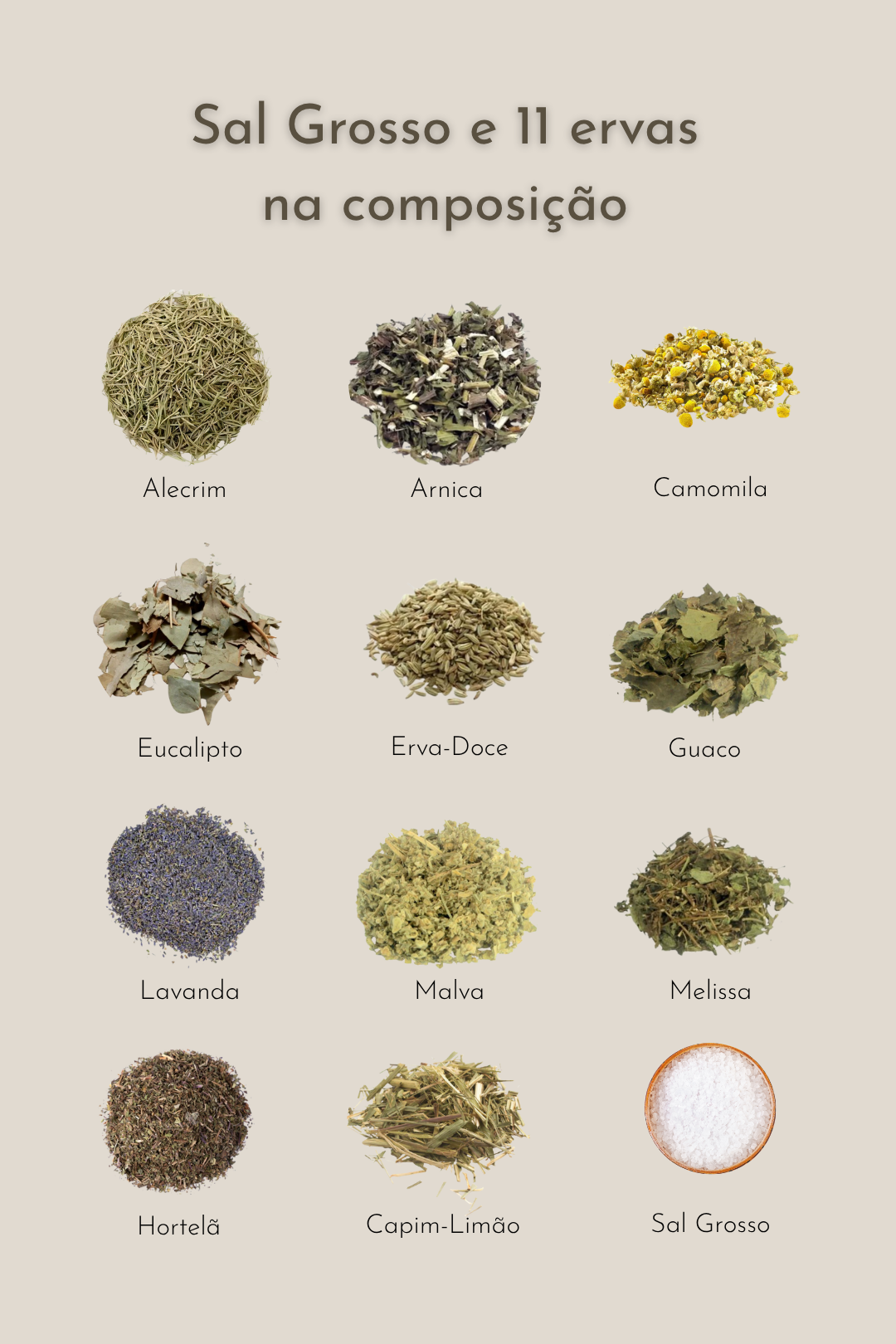 Composição: Sal grosso e ervas desidratas. Ervas: alecrim, arnica, camomila, capim-limão, eucalipto, guaco, hortelã, lavanda, malva e melissa. Confeccionadas em tecido premium 100% algodão.