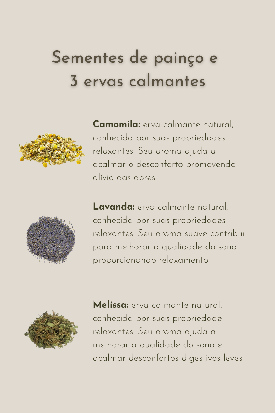 Composição: Sementes de painço e ervas desidratas. Ervas: camomila, lavanda, e melissa. Confeccionadas em tecido 100% algodão.