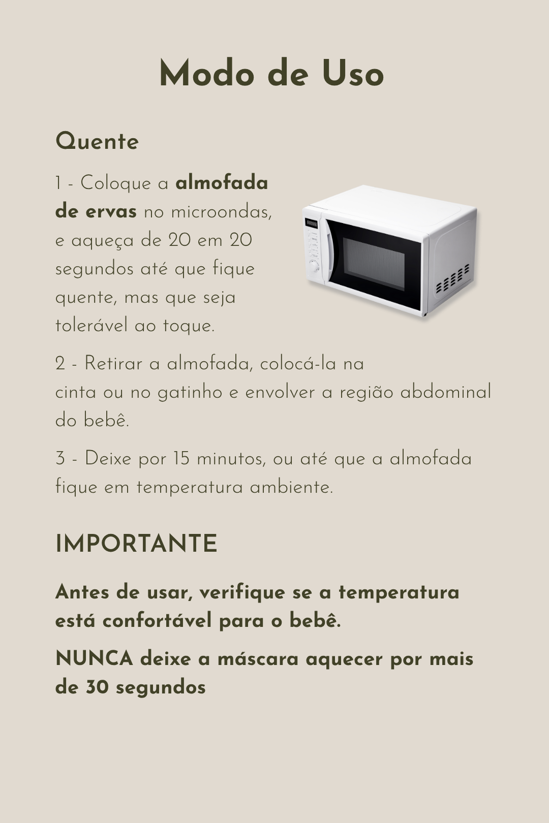 Quando aquecida, a almofada pode ser aplicada com objetivo de aliviar desconfortos gerados pela amamentação e pode ser utilizada em bebês para o alívio de cólicas intestinais. As ervas também possuem papel importante, pois uma vez aquecidas liberam aromas e ativos que auxiliam no processo.