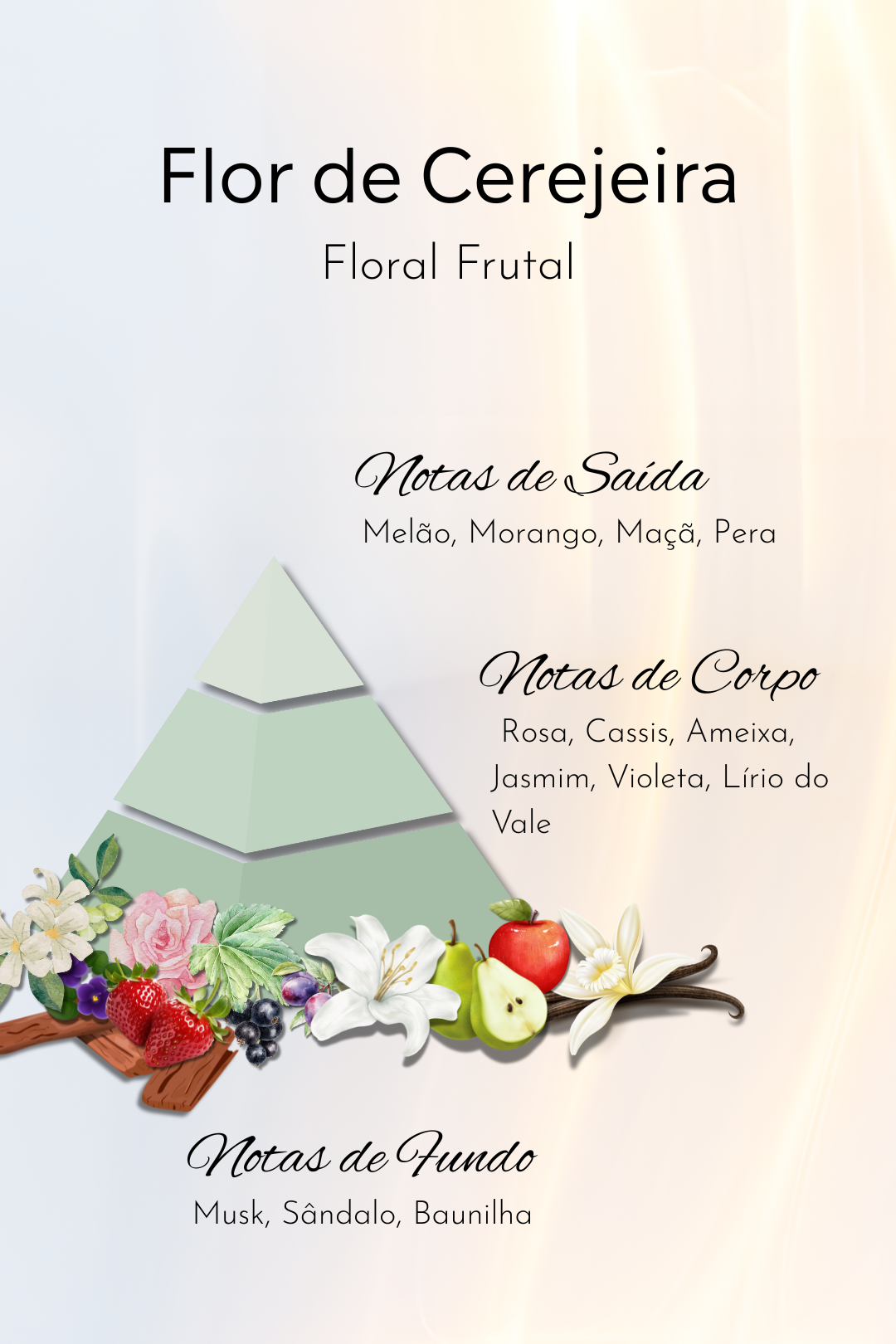 Flor de Cerejeira é uma fragrância floral frutal, que desde as primeiras notas,revela a suavidade frutada do melão, morango, maçã e pera, que se combinam para criar uma abertura fresca, adocicada e luminosa, como o toque de uma brisa morna entre flores recém-abertas. No corpo, um buquê floral elegante de rosa, jasmim, violeta, lírio do vale, cassis e ameixa acrescenta feminilidade e sofisticação, evocando o perfume natural de um jardim florido ao amanhecer. No fundo, a composição ganha profundidade e equilíbrio com o calor do sândalo, o conforto do musk e o toque cremoso da baunilha, resultando em uma fragrância envolvente e harmoniosa, que permanece no ar com suavidade e elegância.