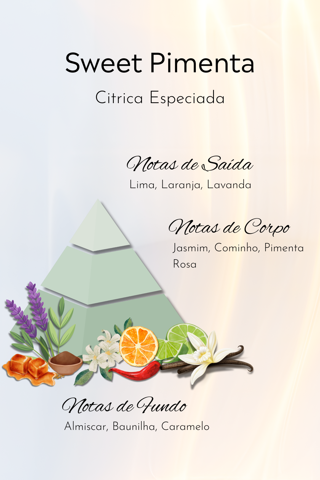 Sweet Pimenta, da família Cítrica Especiada é uma fragrância envolvente e cheia de personalidade. As notas de saída: lima, laranja e lavanda, trazem um frescor vibrante e luminoso. No corpo, o toque exótico do jasmim, cominho e pimenta-rosa revela uma combinação quente e intrigante, que desperta os sentidos. O fundo de almíscar, baunilha e caramelo acrescenta suavidade e doçura, equilibrando intensidade e aconchego.