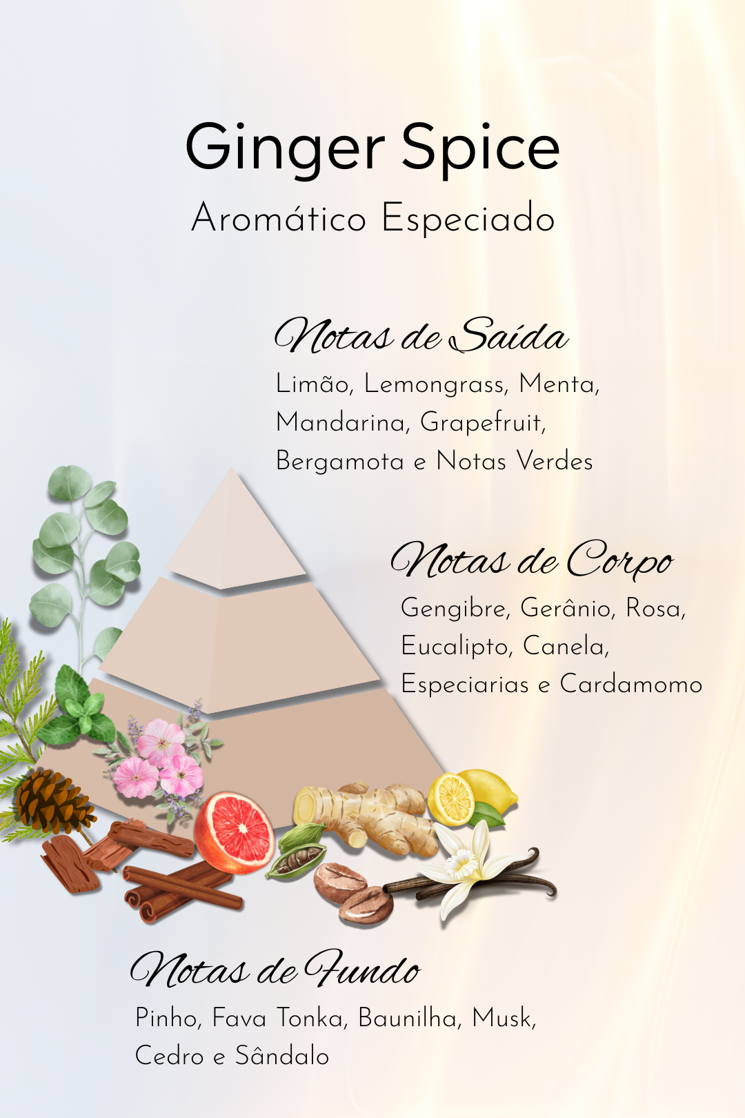 Notas de Corpo: Gengibre, Gerânio, Rosa, Eucalipto, Canela, Especiarias e Cardamomo