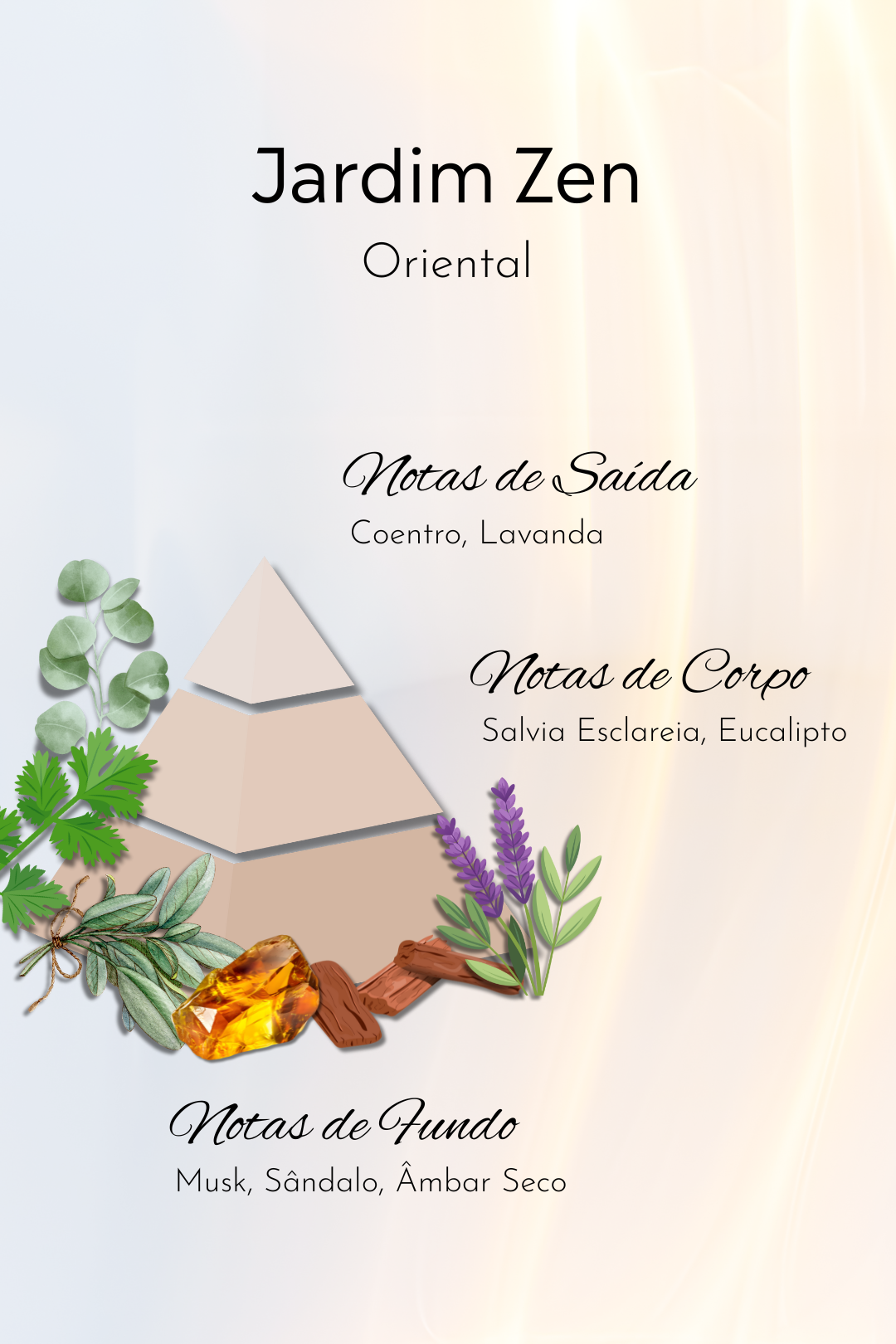 Uma fragrância contemplativa e envolvente, que remete ao silêncio de um jardim sagrado banhado por luz suave. O equilíbrio entre notas frescas e amadeiradas cria uma atmosfera de paz, sofisticação e harmonia interior, um refúgio olfativo que ilumina e acalma a alma.