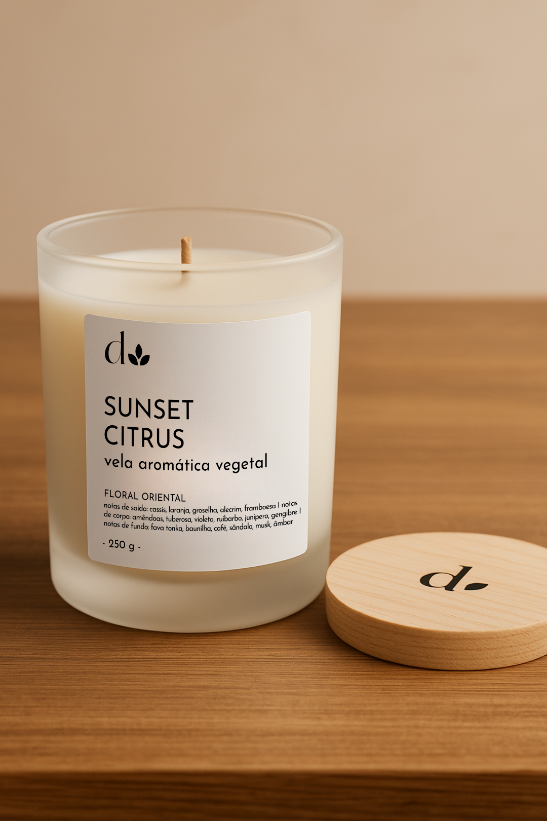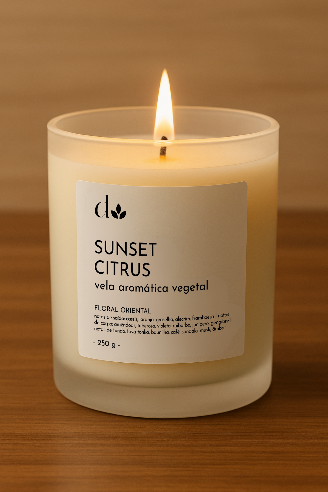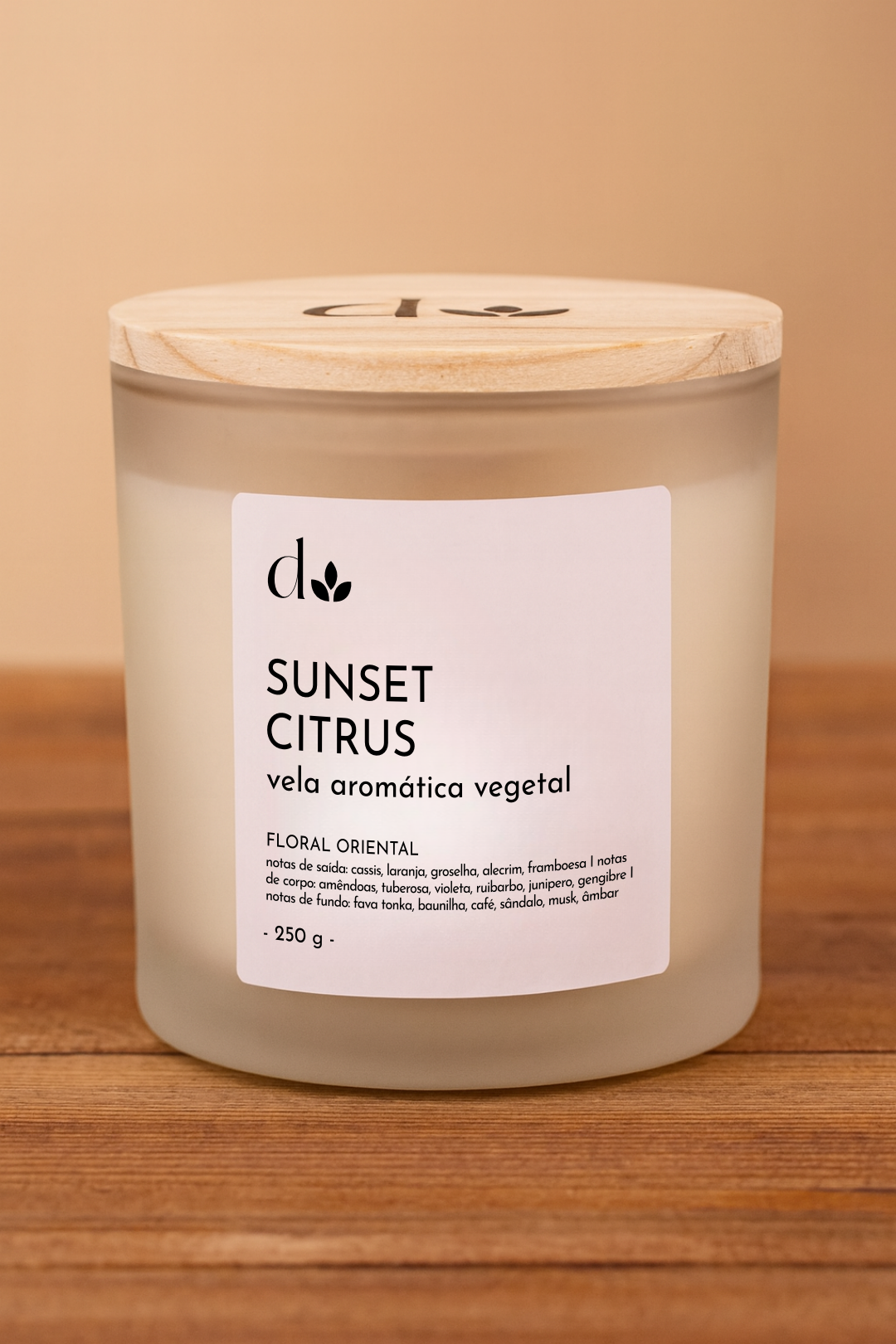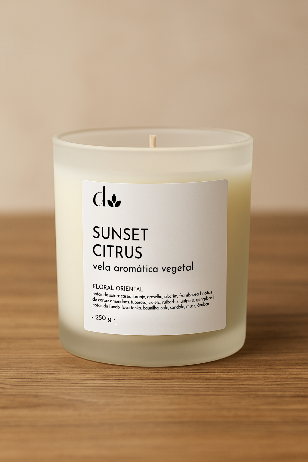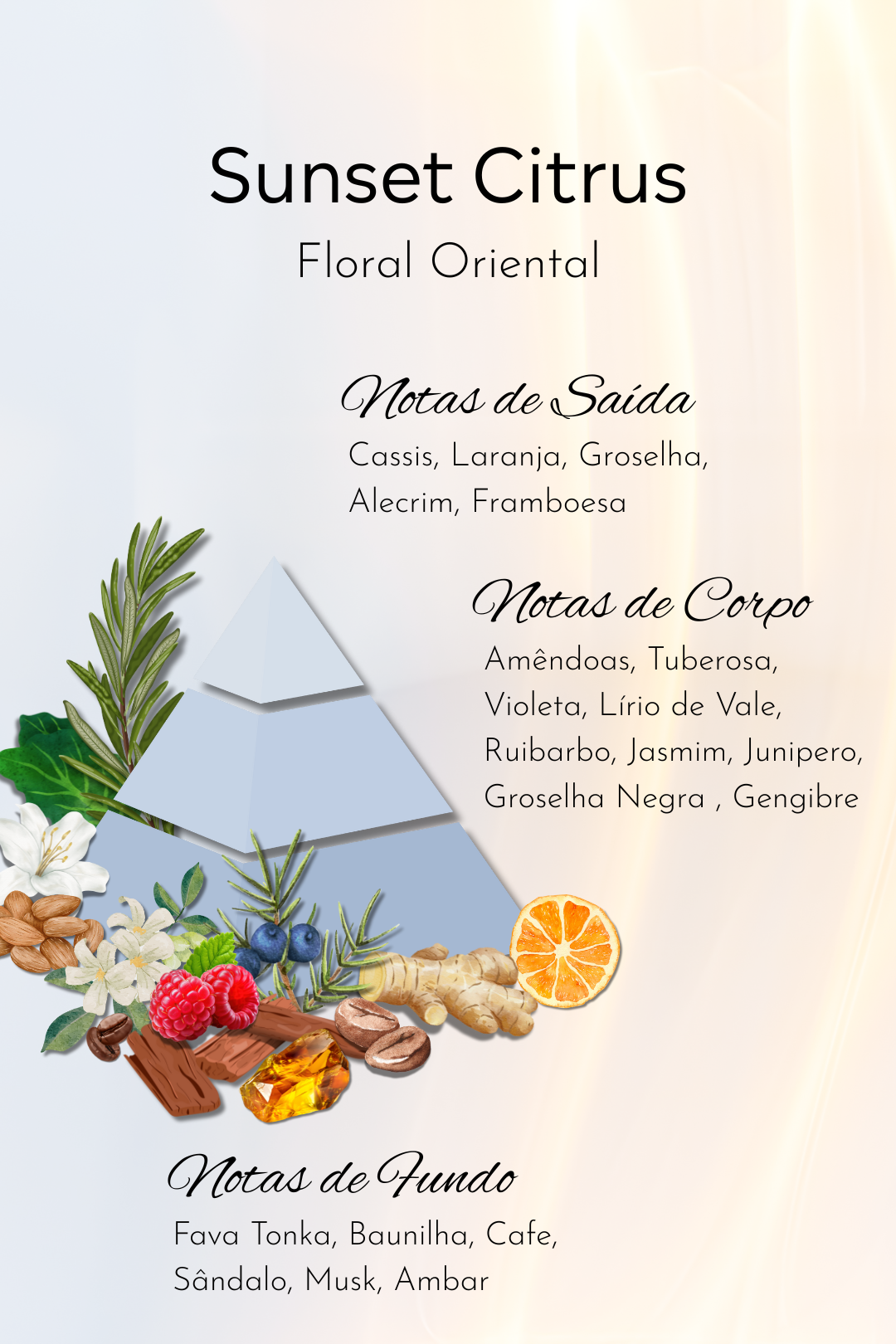 Sunset Citrus, da família Floral Oriental, é uma fragrância vibrante e envolvente que captura a energia dourada do pôr do sol. As notas de saída cassis, laranja, groselha, alecrim e framboesa trazem um frescor cítrico e luminoso, despertando os sentidos. No corpo, uma harmonia rica e intrigante de amêndoas, tuberosa, violeta, muguet, ruibarbo, jasmim, junípero, groselha negra e gengibre revela um coração floral e levemente especiado. Por fim, o fundo quente e sofisticado de fava tonka, baunilha, café, sândalo, musk e âmbar acrescenta profundidade e conforto, como os últimos raios de sol tocando a pele.
